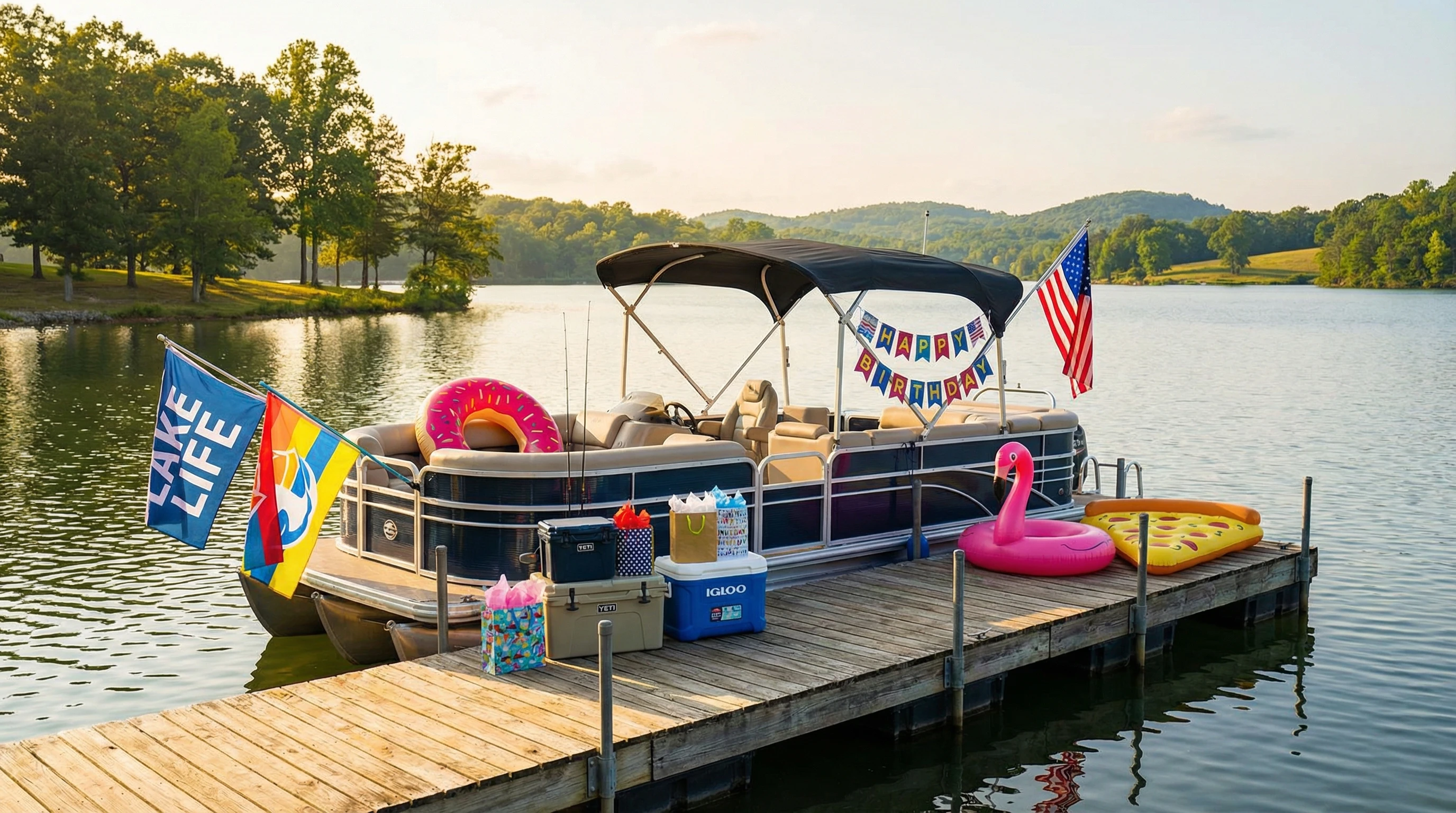 - $50–$200: Rail mounted flag poles, bold lake or nautical flags, grill mounts for pontoon rails, deck mats, marine rope sets, waterproof speakers, and floating LED lanterns for a fresh nighttime atmosphere.